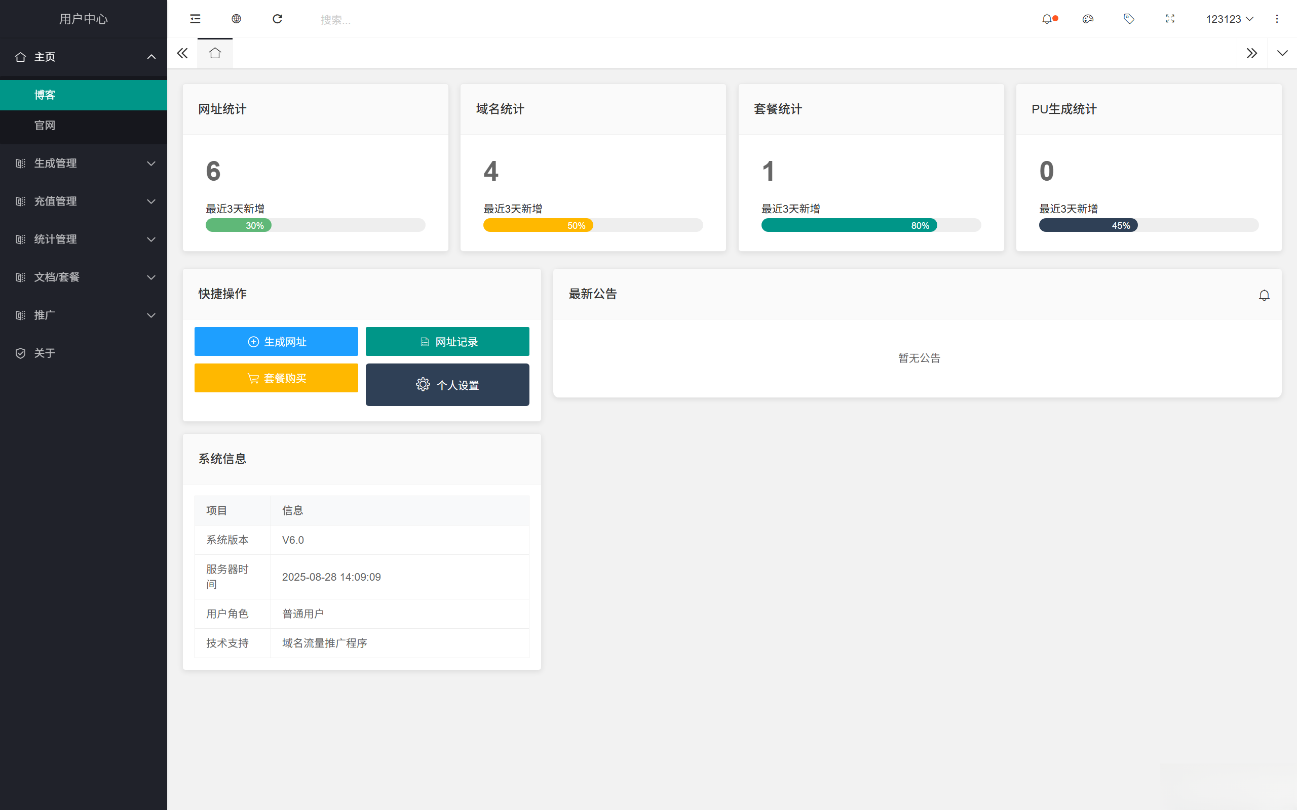 业务处理:网址生成[单次/批量生成,可选域名池,短网址,库Ua等自定义选择]数据化管理,统计每个生成的访问次数
