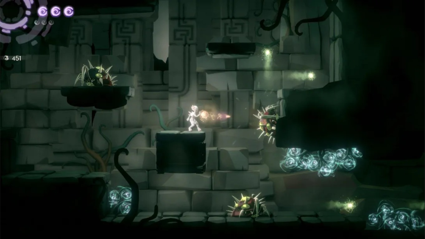 在精心构建的开放世界中自由探索,通过击败强敌、解谜或收集逐步解锁新能力(如二段跳、冲刺、抓墙爬行等),打通此前无法通行的区域。